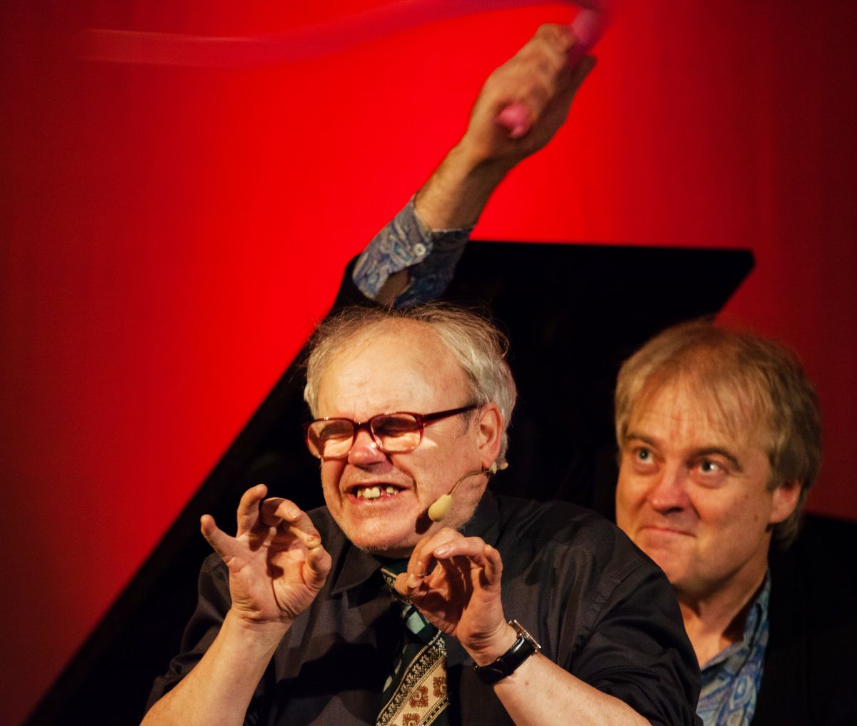 Er entführt die Besucher in den Dada-Kosmos mit Texten von Hans Schüttler (rechts) und Reinhard Lippert in Aktion.