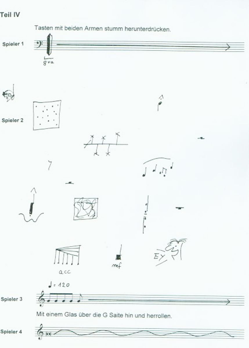 So erklingen im Lautgedicht „Katzen und Pfauen" kreischende Tierlaute. Der Poet und die Instrumente zwitschern hier um die Wette.