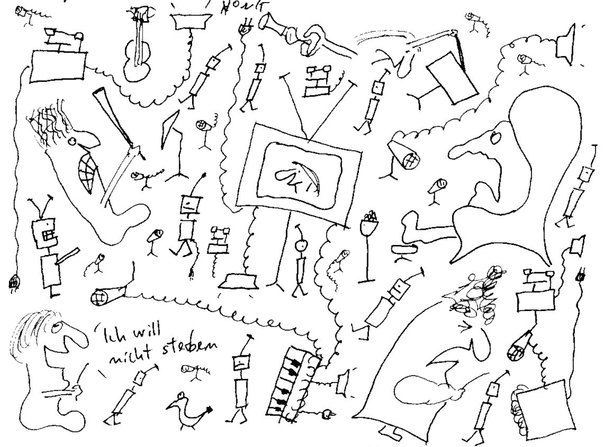Der schon vorher aufgenommene Hörspieltext wird abgespielt und die Musiker müssen dazu spielen. Heinz Erich Gödecke spielt Bassposaune, Rahmentrommel und Perkussion, mein Vater Synthesizer und Theremin. Ein Theremin ist ein elektronisches Musikinstrument, bei dem die Tonhöhe mittels einer Antenne durch Handbewegungen erzeugt wird.