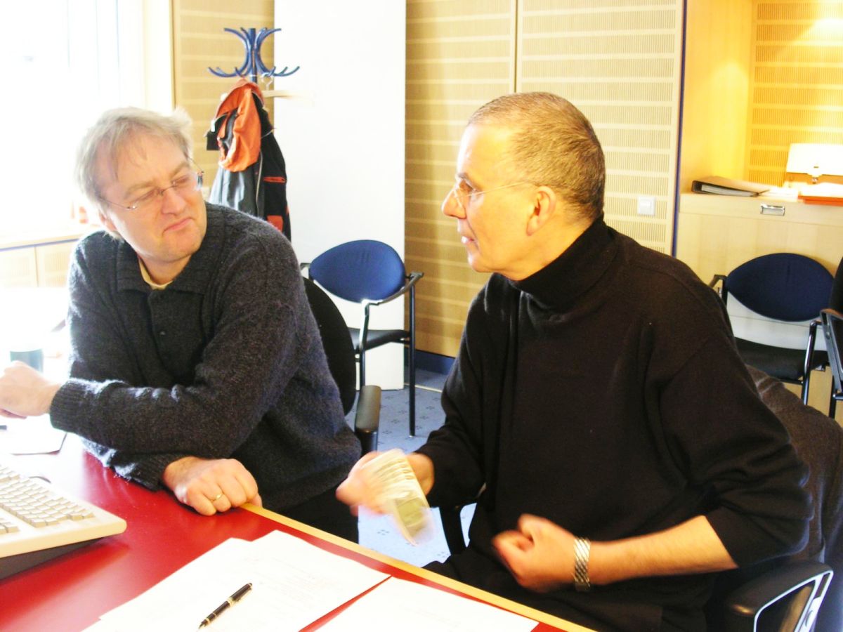 Jetzt muss ich wieder zu der Regisseurin, denn die Aufnahme beginnt. Über den Bildschirm kann ich sehen, wie sich die beiden Musiker, mein Vater und sein Kollege Heinz Erich Gödecke, Kopfhörer aufsetzen. Über die Kopfhörer hören sie den Hörspieltext und die Anweisungen der Regisseurin. Sie spricht über ein Mikrofon mit den Musikern. Schließlich teilt die Regie mit: "Wir sind auf Aufnahme."