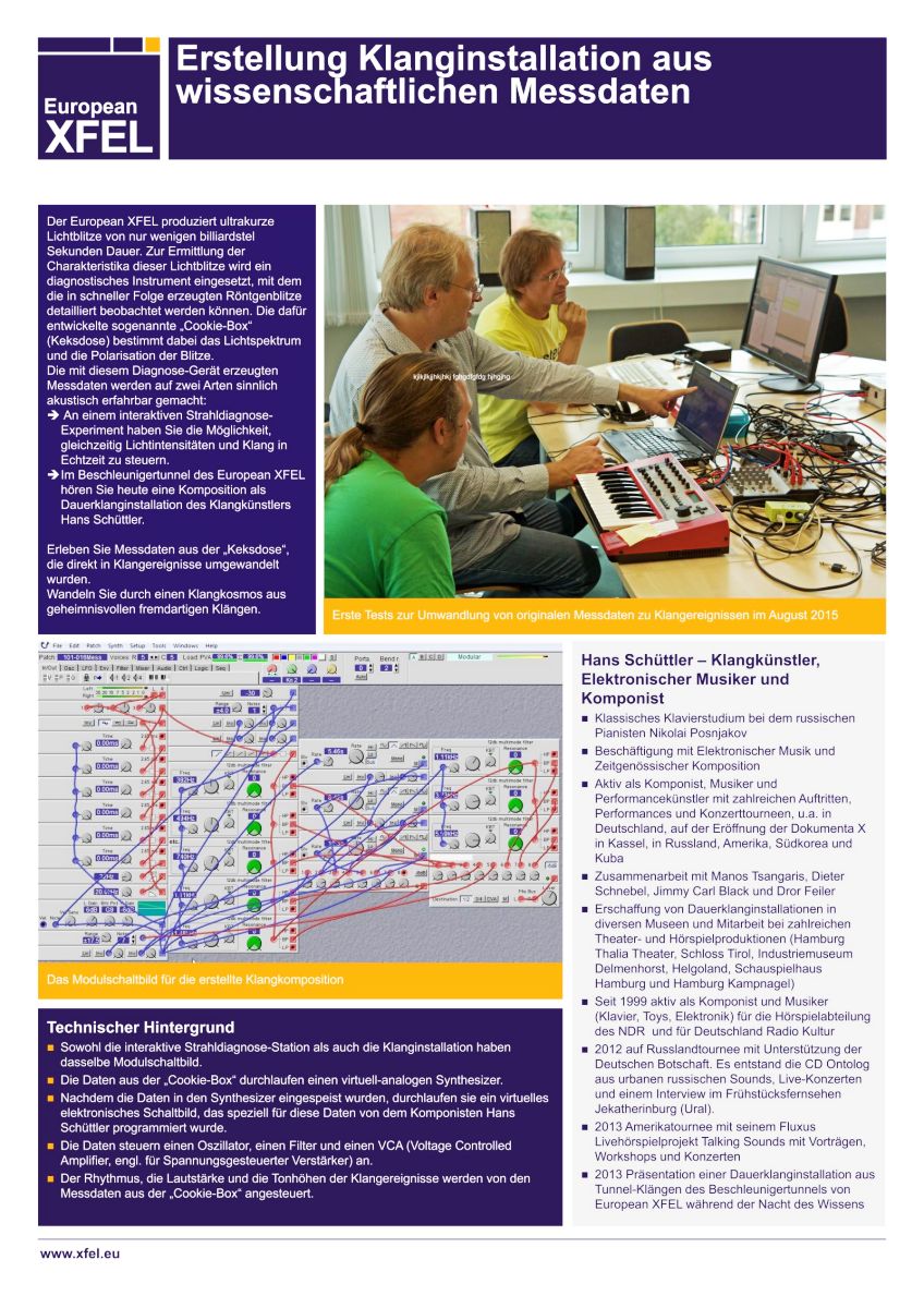 2015 habe ich die technische Kontrollsignale und Arbeitsgeräusche im Tunnel aufgenommen. Die Ergebnisse meiner Arbeit waren in der Nacht des Wissens als begehbare Klanginstallation zu erleben. 2017 habe ich wissenschaftliche Messdaten in Klang umgewandelt in Zusammenarbeit mit den Physikern und Ingenieuren des Instituts. Diese Ergebnisse wurden ebenso auf der Nacht des Wissens präsentiert.